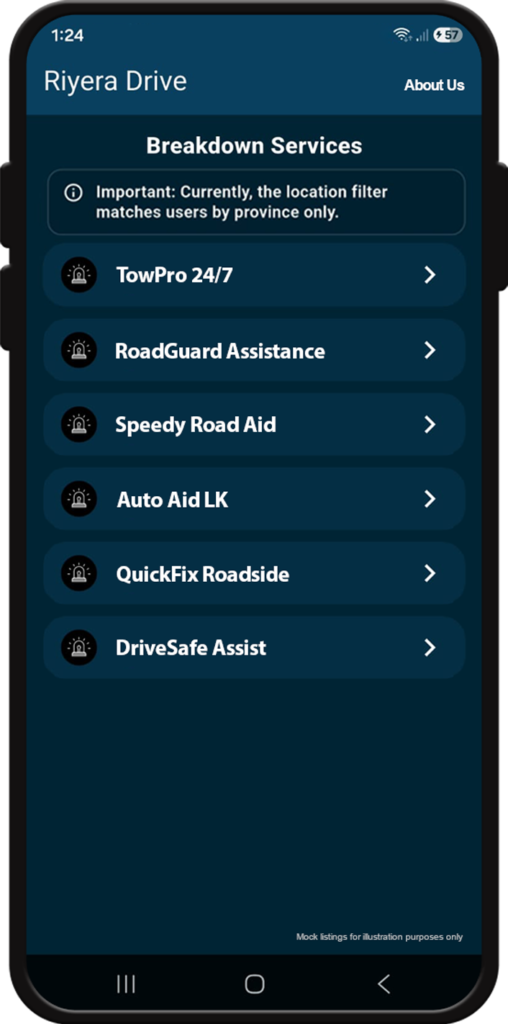 Through our digital platform, we link drivers to a nationwide network of automotive service providers across Sri Lanka, including repair centers, spare parts retailers, tyre shops, oil marts, fuel stations, EV charging points, and other essential vehicle services. We also operate a comprehensive online marketplace offering vehicle body parts, aftermarket replacements, safety products, and interior and exterior accessories. Additionally, Riyera develops innovative safety and entertainment systems designed to improve driver convenience, confidence, and overall driving experience.